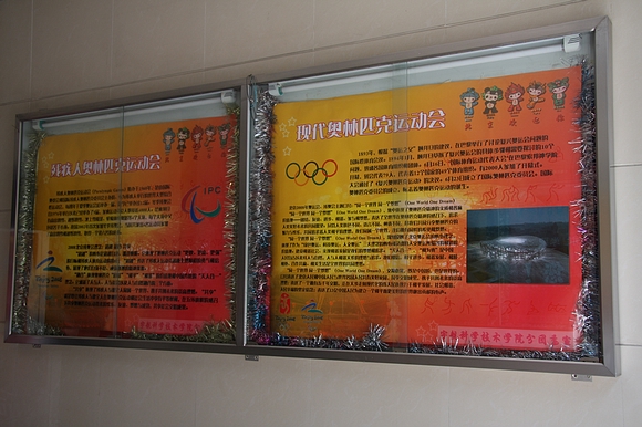 离北京2008年奥运会开幕仅有23天,为了更好的营造奥运氛围,宣传奥运文化,宇航科学技术学院分团委在三号楼布置了自己设计的奥运宣传海报。