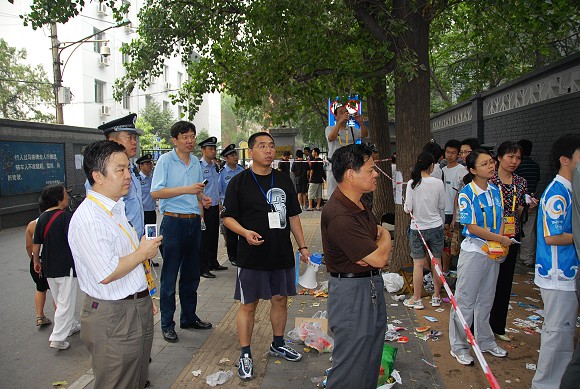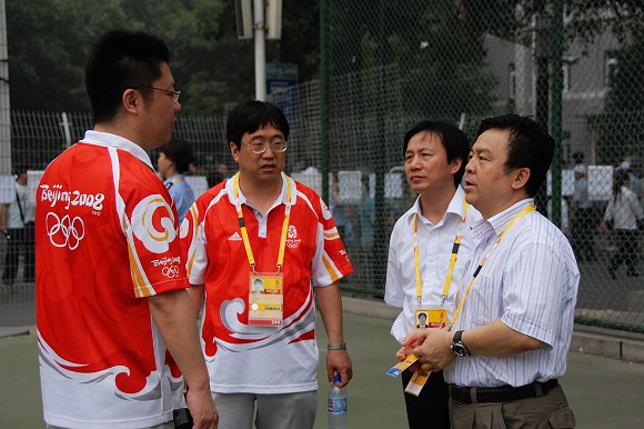 米兰体育馆场馆主任、我校党委副书记、副校长杨宾(左)也来到现场查看排队情况。