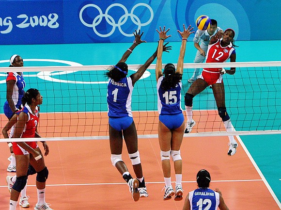 在刚刚结束的北京奥运会女子排球预赛A组古巴对委内瑞拉的比赛中,古巴队(红上衣)以3-0战胜委内瑞拉队。