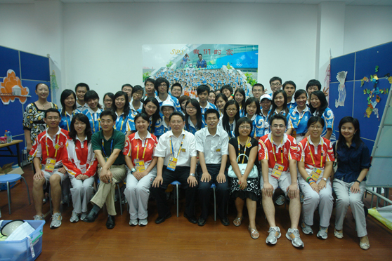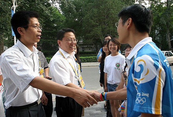 8月18日下午,团市委副书记姜泽廷(左二)来到米兰milan官方网站,慰问我校京外、境外奥运志愿者。米兰milan官方网站团委书记徐强等人陪同姜泽廷等团市委工作人员一同到米兰milan官方网站场馆、京外、境外志愿者驻地慰问志愿者。姜泽廷副书记来到米兰milan官方网站体育馆,慰问场馆志愿者,为了表达对澳门志愿者的感谢,姜副书记亲手给每一位澳门志愿者佩戴了一枚微笑圈。随后,姜副书记讲到:“大家为北京奥运会的成功举办做出了很大的贡献,给中外来宾留下了美好的印象,希望你们能够经常来北京,北京永远欢迎你们!众所周知,我国奥运健儿在北京奥运会上奋力拼搏金牌总数连创新高,这些好成绩的取得和我们志愿者出色的服务工作是密切相关的,希望大家再接再厉夺取志愿服务的金牌。澳门志愿者人数虽少,但是却极具代表性,你们用实际行动表达了澳门同胞对北京奥运会的强烈的支持。大家已经取得了比较优异的工作成绩,但是没有最好只有更好,希望大家能在接下来的工作中取得更大的进步!”