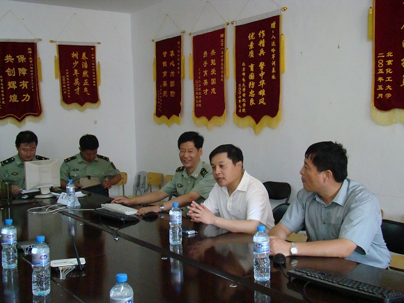 参观结束后,胡校长在指挥部会议室与指挥部主要带队领导进行了会谈。会上,胡校长谈到,虽然今年我校两届学生同时参加军训,军训工作面临着很多困难。但带队干部始终工作在军训第一线,保持良好的工作状态,胡校长代表学校党委、行政慰问所有带队干部,并对军训工作给与充分的肯定。