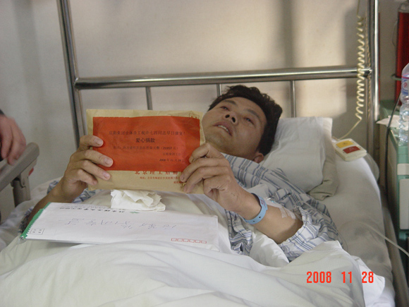 11月28日下午,后勤集团党委书记巫后新、工会主席姜金凤、工会副主席宋希博、办公室主任李秋香、物业中心副主任聂正喜、高建利再次前往医院,将这笔爱心捐款送至许七四病床前。集体的温暖、同志们的关爱,使这条昔日的硬汉热泪盈眶,我们衷心的希望许七四同志能够勇敢的面对这次人生的挫折,努力进行康复治疗,重新燃起生活的信心。寒山碧水,惟情不老,萧萧故垒,惟爱永生。