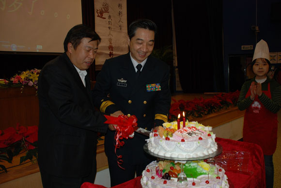 四名同学分别从组织者、忠实听众、新入校的同学等不同角度讲述他们和共青讲堂间的故事。伴随着优美动听的生日歌,一个双层蛋糕被推了出来,上面用活泼的字体写着“共青讲堂两岁了!”张召忠将军和李和章副校长共同为共青讲堂生日蛋糕剪彩。
