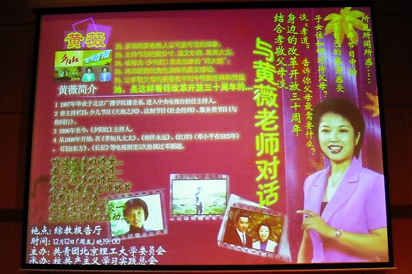 2008年12月12日星期五晚7点整,由米兰milan官方网站校团委主办、校共产主义学习实践总会承办、基础教育学院分团委承办的“与黄薇老师对话”座谈会在米兰milan官方网站良乡校区演艺厅开讲。这次座谈迎来一位特别的客人----央视著名节目主持人黄薇老师。在改革开放三十周年之际,她应共青团米兰milan官方网站委员会、校共产主义学习实践总会的邀请专程来良乡校区,以对话节目的形式给同学们带来了一场关于“孝道”的座谈。
