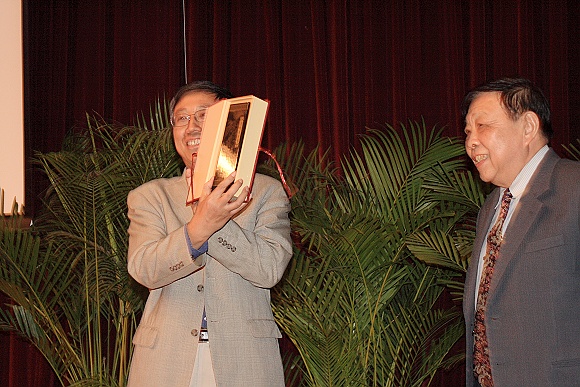 最后,王越院士代表学校向田院士赠送纪念品并再次感谢田院士给我校师生带来的一场高水平学术报告。本次报告是研究生院、理学院拓宽理科国际化视野,向国际一流大师学习,增进交流与合作的一次重要活动,旨在激发广大师生对数学学科的兴趣,对于高水平创新型人才培养具有重要意义。
