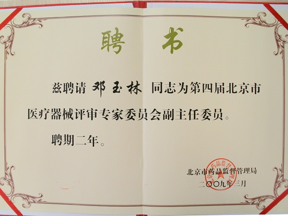 邓玉林教授被聘为北京市医疗器械评审专家委员会副主任委员