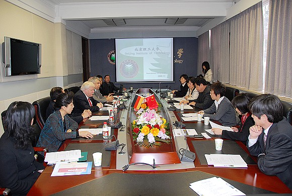 2009年4月2日下午,德国卡尔斯鲁厄大学Hippler校长一行访问我校,我校校务委员会主席郭大成书记代表学校亲切会见了Hippler校长一行。双方进行了友好会谈。会谈由国际交流合作处汪滢副处长主持。留学生中心主任王恩林、机械与车辆学院常务副院长唐水源、计算机学院院长黄河燕、化工与环境学院副院长冯金生、理学院副院长胡海云、德语系系主任姜爱红以及国际交流合作处项目官员高珊参加了会谈。