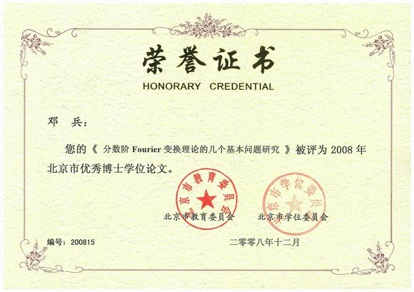 我校邓兵博士学位论文被评为2008年北京市优秀博士学位论文