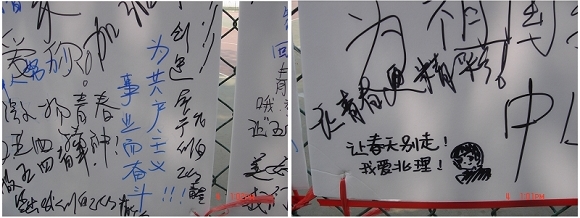 上午11:30,校研工委、校研究生会在新食堂对面同时举办了“五四运动九十周年青年感言‘纪念墙’”和“佩戴团徽,纪念九十年前那火热的青春”活动。校研究生会的学生干部热情邀请全校的青年师生在“五四运动九十周年青年感言‘纪念墙’”上书写自己的五四感言,并将一份份《弘扬五四精神 贡献青春力量》倡议书和一枚枚闪亮的团徽赠送给每一个参加活动的同学,希望大家通过佩戴团徽来纪念五四先辈的伟大精神,继承他们矢志不移追求的崇高理想。不到一个小时,“纪念墙”上便留下了同学们密密麻麻的感言。