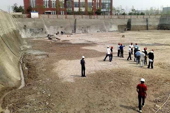 参加验槽的领导和技术人员走下1号公寓基槽底部,对基槽的各项验收项目认真检查,经过会议讨论,1号工地基槽满足承载力要求,同意进行下一道工序施工。