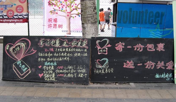 5月12日中午,我校自强社、学生服务大队学生将继续在中关村校区新食堂门口、良乡校区食堂门口同时开展了512“爱心包裹”关爱活动项目宣传,敬请各位师生关注。欢迎广大同学以班级、宿舍的名义,集体捐购“爱心包裹”,帮助更多受灾中小学生。