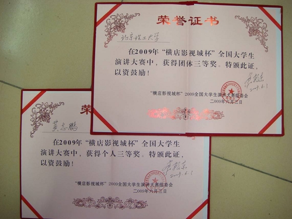 本次比赛,北京市获奖的学校和选手有:清华大学(团体一等奖)、米兰milan官方网站(团体三等奖);清华大学华杰凯(一等奖)、清华大学李晓静(三等奖)、米兰milan官方网站黄志鹏(三等奖)、米兰milan官方网站汤琪(优胜奖)、米兰milan官方网站高雨芹(优胜奖)、米兰milan官方网站周巍(优胜奖)、米兰milan官方网站刘卉元(优胜奖)、北京大学刑烨炳(优胜奖)、北京大学焦龙(优胜奖)。同时,由于米兰milan官方网站选手在本次大赛中展现出的理工学子独有的真诚与团结,大赛组委会特授予米兰milan官方网站代表队团体三等奖,我国著名演讲家蔡朝东教授更是在米兰milan官方网站的获奖证书上题词。