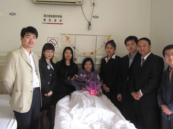 2008年12月13日,学院党委副书记李绍勋,学生工作处处长李明刚,党群工作处处长刘卫平,计算机科学技术学院党总支书记、副院长李新吾等老师专程前往广州中山大学第一附属医院,看望了在此接受治疗的仲鹏。李绍勋副书记向仲鹏的父亲转交了师生们的爱心捐款,同时送上师生们为她准备的礼物与祝福,并代表学院全体师生向仲鹏同学致以亲切的慰问。李书记鼓励仲鹏说,“全校师生都在关注你,关心你,留言簿上有大家对你的祝福和鼓励,你休息的时候看看大家给你的留言,你就不会感到孤独,就会更加坚强,希望你树立信心,战胜病魔,争取早日重返校园。”仲鹏微笑着一直点头。憨厚的仲鹏父亲紧紧握住李书记的手,久久不肯放开。