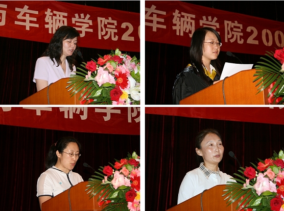 分党委副书记、副院长阎艳老师(左上)主持了2009届毕业典礼。学生代表燕鑫同学(右上)代表全体2009届毕业生发言:在即将与母校、与同学离别之际,对四年来父母的无私关爱,老师们的谆谆教诲,辅导员的细微关心,班主任的体贴叮咛和同学们的热情帮助表示感恩,表达了对母校依依不舍的感情。同时,也代表学院全体毕业生郑重承诺,将以饱满的激情投身社会、服务社会、为母校争光。