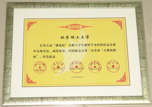 在学校领导的亲切关怀下,在相关部门的大力支持下,在各学院的积极配合下,在同学们的热情参与下,我校“世纪杯”竞赛进展顺利,并从中选出12件优秀的作品参加了首都挑战杯竞赛。在首都挑战杯竞赛中,我校参赛作品分别获得特等奖3项、一等奖4项,二等奖4项。我校以团体总分第三名的成绩获得“首都优胜杯”。
