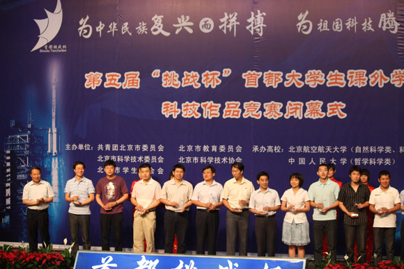 6月22日下午,历时三个多月的第五届“挑战杯”首都大学生课外学术科技作品竞赛在中国人民大学成功落下帷幕,大赛共评出各个等级423项个人奖、15个团体奖和若干组织奖。团中央学校部、全国学联办公室、北京市委教工委、北京团市委、北京市教委、北京市科委、北京市科协、北京市学联、中国人民大学、北京航空航天大学等首都“挑战杯”竞赛指导单位和主办、承办单位领导出席了闭幕式,首都各高校团委科创工作负责人和获奖学生代表400余人参加了闭幕式。