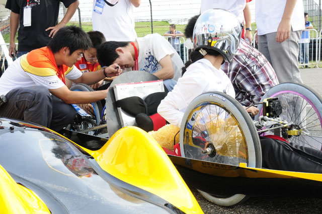 创办于1981年的Honda节能竞技大赛于2007年开始正式进入中国,今年迎来了第三届。本届节能竞技大赛以“挑战一升、环保一生”为口号,要求参赛车辆使用统一的Honda 125cc低油耗4冲程发动机,发动机以外的车架和车身等完全由各车队独立创作,赛车在上海赛车场赛道内跑完指定赛程,最终来竞技谁消耗的燃油更少。