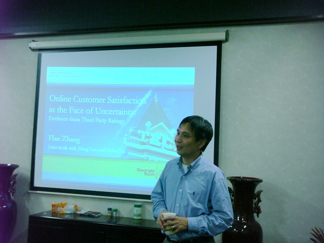 为了更好地推动管里与经济学院的学术交流活动,营造开放的学术氛围,2009年 9月28日,管理与经济学院特邀美国佐治亚理工大学管理学院张晗博士为管院师生作题为“影响在线客户满意度的不确定因素分析(Online Customer Satisfaction in the Face of Uncertainty: Evidence from Third Party Ratings)”的学术报告。