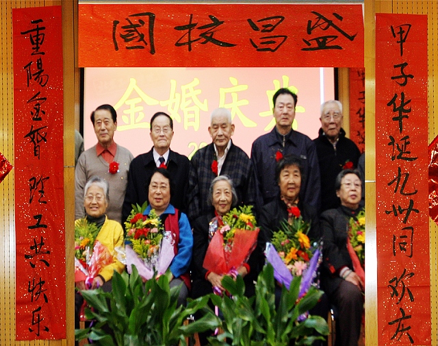 郭大成还特地亲笔写下对联“甲子华诞九州同欢庆,重阳金婚理工共快乐”,祝福金婚夫妇幸福美满,更祝福学校和祖国繁荣昌盛。