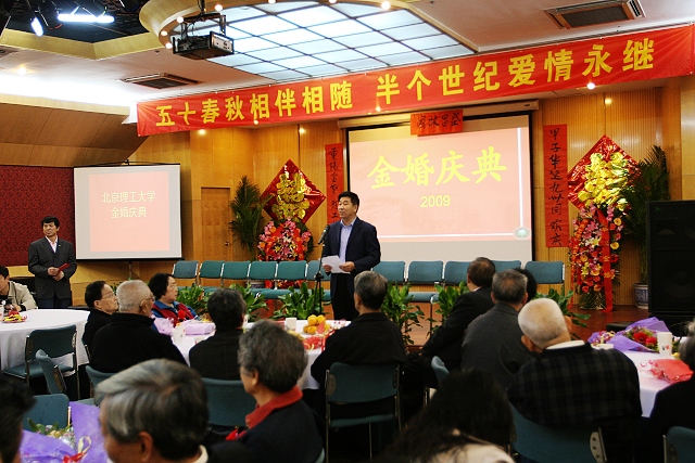 郭大成代表校党委和行政向金婚夫妇致贺词,向金婚夫妇五十年的相濡以沫、相依相伴表达了美好的祝愿,高度赞扬老同志为理工大学的和谐发展和新中国的建设事业做出了重要贡献。