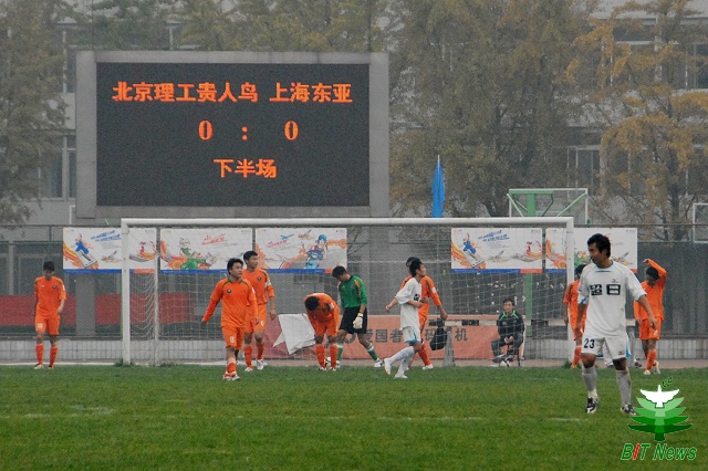 比赛易边再战,东亚队在中后场几次传递后将球推进到前场,在边路传中,被理工门将化解。下半场第5分钟,占据场上主动的东亚开始调兵遣将,13号朱峥嵘换下12号吕文君,11号姜至鹏换下8号曹赟定。第12分钟,东亚队在边路展开攻势,理工组织起防守破坏了东亚队的进攻。第17分钟,理工队发动反击,东亚队防线出现漏洞,被理工队抓住机会孙上大力射门,险些攻破了顾超把守的球门。