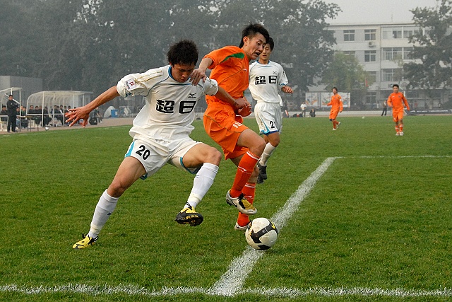 比赛开始后,双方都踢得比较积极,第4分钟,东亚队组织进攻,8号曹赟定中路转移到边路王云龙,可惜皮球出了边线。随后理工队在防守东亚比赛中犯规,东亚前场任意球,可惜未能形成威胁。第6分钟,东亚队长王佳玉在中前场争夺高空球有一个压人动作被判犯规,而他自己也受伤倒在地上。开场10分钟,双方都还没有一脚射门,多在中场展开争夺。