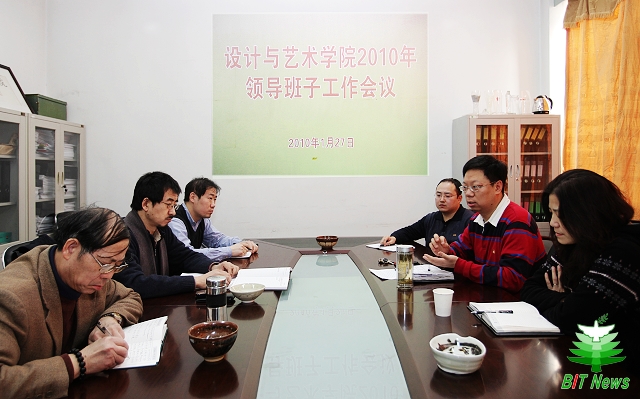 杨海滨和主持工作的杨建明首先对学院领导班子成员在2009年的工作给予肯定。他们认为,过去一年对于设计与艺术学院是充满了机遇和挑战的一年。新一届院班子上任以来,学院在经历了短暂而必要的过渡期后,各项工作逐渐步入正轨,学院整体发展在过去一年中有了长足进步,整体氛围更加和谐稳定。这些成果离不开学校党委及行政的正确领导和热忱关怀,也离不开学院领导班子及全体教职工的辛勤工作和无私奉献。在成绩与赞扬之后,每一位班子成员也面临着更大的责任与压力。不进则亡,慢进则退。在2010年以及今后几年中,能不能带领学院在和谐稳定的基础上实现又好又快发展,成为班子成员面临的严峻课题。杨海滨书记希望班子成员将所有精力和智慧运用到谋划学院未来发展上,共同描绘学院2010年的规划蓝图。