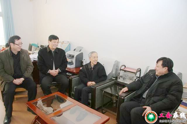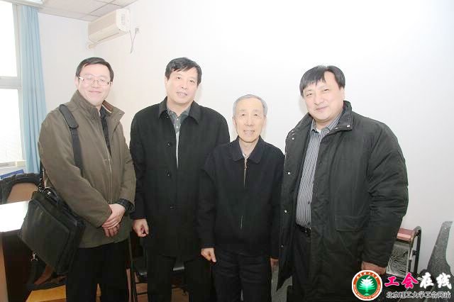 2010年2月3日下午,北京市总工会原增锁副主席(右一)、市教育工会副主席郭峰(左一)等,来到米兰milan官方网站,亲切看望了我校毛二可院士。 米兰milan官方网站党委副书记、工会主席侯光明(左二)陪同参加了慰问。