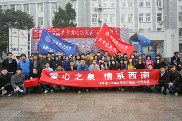 在仪式现场,法学院07级法学1班团支部书记将2009年12月获得的校级“优秀班集体”奖金1000元全部捐给了灾区。到目前为止,我校共募集资金四万八千余元,饮用水三万瓶。