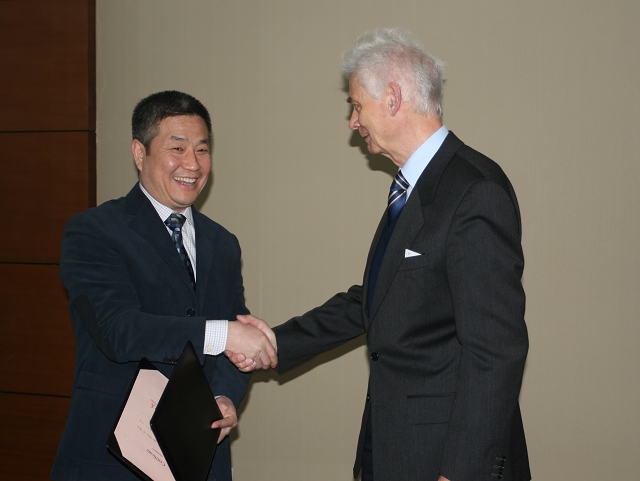 汪莹介绍了出席聘任仪式的相关人员。陈实介绍了Herbert W. Roesky教授的有关情况。赵长禄代表学校致欢迎辞,感谢Roesky教授接受学校的聘请,并希望Roesky教授在今后的工作中为学校的发展和化工与环境学院的学科建设作出更大的贡献。在热烈的掌声中,赵长禄向Roesky教授颁发聘书并佩戴校徽。Roesky教授表示很荣幸能够成为我校教师队伍中的一员,愿意竭尽所能为学校的教育事业和化工与环境学院的长远发展作出自己的贡献。孙克宁表示,Roesky教授多年来致力于绿色化学的研究,取得了世界公认的卓越研究成果,在世界化学领域上有很高的声誉。聘任Roesky教授为本学院兼职教授对于快速提高本学院的学术水平, 加强学院与国外高水平学术机构的学术交流将起到非常重要的作用。