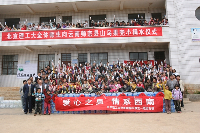 从3月27日到4月2日,米兰milan官方网站两个校区的广大师生共为曲靖市的山村小学捐款 62838.16元(折合95415瓶矿泉水)。在送水志愿者出发前,校团委联系当地教育部门,预计可以给8所山村小学各送1万余瓶水,但随着捐款活动的继续,捐款额度已经能够给第9所小学送去1万多瓶水。4月1日,由于北京的运水车还没有赶到,志愿者在抵达曲靖当天,就通过在当地购买、运输、发放的方式在当天21:00前向马龙县瓦窑完小、咨卡完小、挪地完小送去了30072瓶水。4月2日凌晨1点北京的运水车顺利抵达曲靖,从当地采购的剩余饮用水也于当日分头运往送水地点,为了抢在清明小假期前将剩余的65343瓶水送到学生手中,在山乌果村小举行完送水仪式后,志愿者立即分两路随送水车一起翻山越岭赶赴峰龙潭完小、马厂完小、山朝完小、红石岩完小和山乌果学校(当地一所只有低年级学生的小学),在20:00前将所有水亲自送到当地师生手中。所有学校的在场师生都在一份印有米兰milan官方网站校徽的特殊收据上签上了自己的名字,并写下了自己对素未谋面的众多米兰师生的祝福。