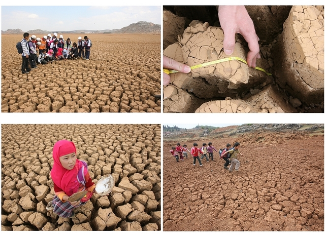 在返程的途中,志愿者来到温总理前几天刚刚到过的陆良县大莫古镇德格海子水库,偌大的水库不仅空空如野,而且地面上全都是宽10几公分,深50几公分的裂缝。由于水库干涸,雾露顶完小六年级的彝族学生昂双丽和她的老师同学每天只能喝从煤井里面抽取的、看起来很清但却没有经过任何检测的水。