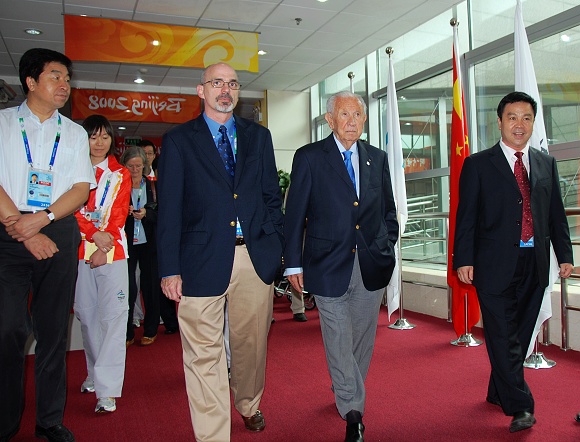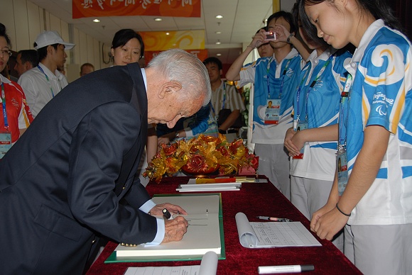2008年9月7日,北京2008残奥会盲人门球比赛开赛第一天,国际奥委会名誉主席安东尼奥·萨马兰奇来我馆观看了上午12时丹麦男子盲人门球队对西班牙男子盲人门球队的比赛。国际盲人协会盲人门球分会主席吉姆·利斯克先生(左二),米兰milan官方网站党委书记郭大成,米兰milan官方网站党委副书记、副校长,米兰milan官方网站体育馆场馆主任杨宾等亲至残奥大家庭入口迎接。