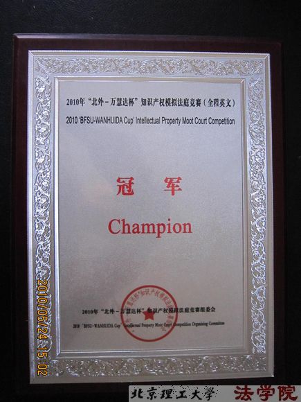 5月22日和23日,由我国最高人民法院知识产权庭、北京外国语大学法学院和万慧达知识产权代理公司主办的第三届“北外—万慧达杯”知识产权法英语模拟法庭竞赛在北京外国语大学举行,在本届比赛中,由我校法学院侯仰坤老师和李磊老师指导并带领的我校九人代表队经过两天的艰苦奋战,最终夺取了比赛的冠军,为我校赢得了荣誉!
