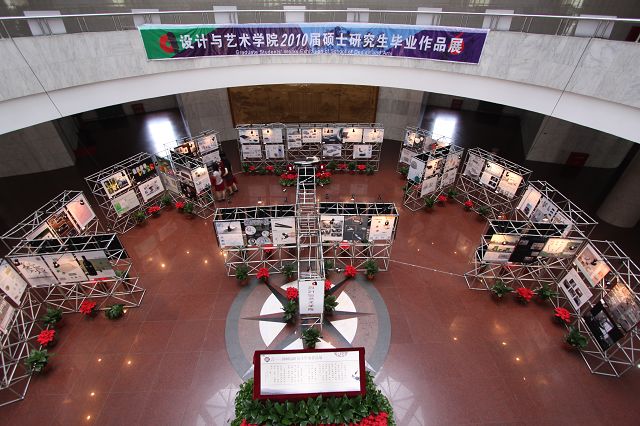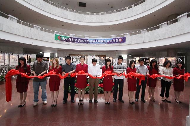 2010年5月26日上午10:00,设计与艺术学院2010届硕士研究生毕业作品展在中心教学楼一层大厅隆重开幕,校纪委书记杨蜀康、研究生院副院长李镇、校团委书记徐强、学生工作处常务副处长杨海、学生工作处副处长许欣及设计学院的领导、老师、学生代表出席了开幕式。开幕仪式由设计学院副书记、副院长丛磊主持,丛磊老师简要介绍了本次展览的基本情况和意义,并邀请出席活动的领导为展览开幕剪彩。