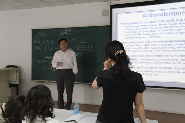 6月12日上午,美国Emory大学聂书明教授,受材料学院邀请来我校做学术交流,报告会在研究生楼举行。生命学院院长邓玉林、材料学院院长邹炳锁、材料学院董宇平教授、冯增国教授、理学院张小玲教授、生命学院屈锋教授等,以及材料学院和生命学院部分师生数十人参加了报告会。