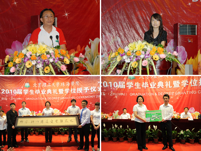 珠海学院李欢同学代表2010届毕业生发言,表达了对母校培育之恩的感激之情、勇于迎接挑战的信心和对母校及老师的祝福。艺术学院2010届毕业生为母校赠送纪念品,机械与车辆学院2010届毕业生陈宗把自己的毕业设计作品《米兰milan官方网站珠海学院虚拟校园》赠给母校留念。