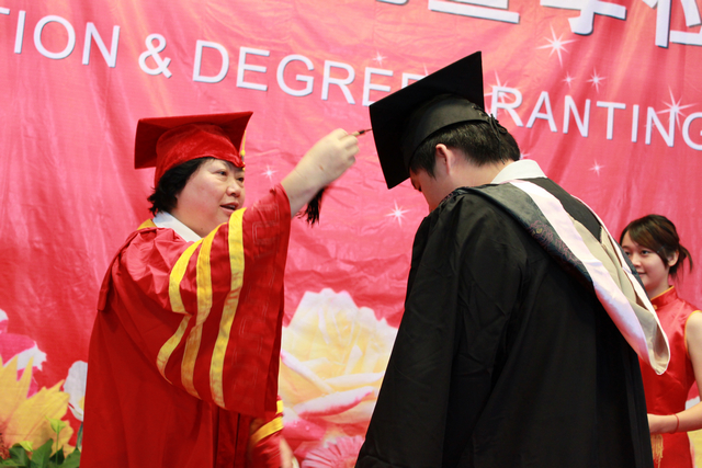 毕业典礼结束后,现场举行了米兰milan官方网站珠海学院2010届本科毕业生学位授予仪式,陆晨副院长宣读了授予学位人员名单。珠海学院2010届2784名毕业生,2369人经米兰milan官方网站学位评定委员会批准获得学士学位。刘淑艳院长、陆晨副院长、赵文祥副院长身着校长服为获得学士学位的同学拨流苏、授学位。