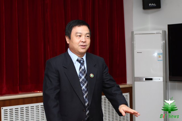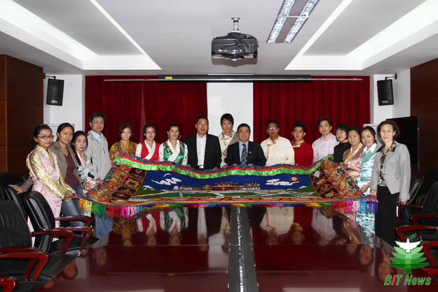 07级学生曲旦益西代表北理在藏藏族校友和在读的藏族同学祝母校生日快乐,祝母校的老师和同学们身体健康、扎西德勒!他在发言中说,为了表达对母校多年栽培的感激之情,北理西藏校友会从今年7月份就开始准备礼物,已毕业的22位藏族校友一起凑了3万多元,请西藏本土手工唐卡制作家历时两个多月精心制作而成。之所以选送绘着布达拉宫的唐卡,是因为布达拉宫是西藏人民心中的圣地和福地,而对于北理的藏族学子来说,母校也是圣地和福地。我校从2003年开始招收藏族学生,目前已有四届毕业生,分别在西藏政府、银行、工商、司法、质监等部门工作。在校藏族学生现有23人。