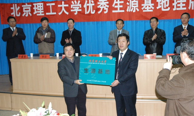 之后,会议举行互赠纪念品及生源基地授牌仪式。由我校副校长杨宾教授和张家口市副市长唐卫斌分别向张家口市委市政府和米兰milan官方网站赠送了纪念品,杨宾副校长将“米兰milan官方网站生源基地”牌授予张家口市第一中学牛学军校长。