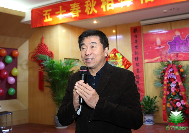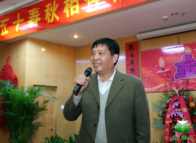校党委副书记侯光明代表校党委和行政向金婚夫妇致贺词,向金婚夫妇五十年的相濡以沫、相依相伴表达了美好的祝愿,高度赞扬老同志为理工大学的和谐发展和新中国的建设事业做出了重要贡献。各对金婚夫妇原单位领导向金婚夫妇赠送纪念品,表达敬意与慰问,祝福他们健康长寿并合影留念。