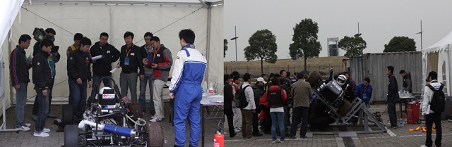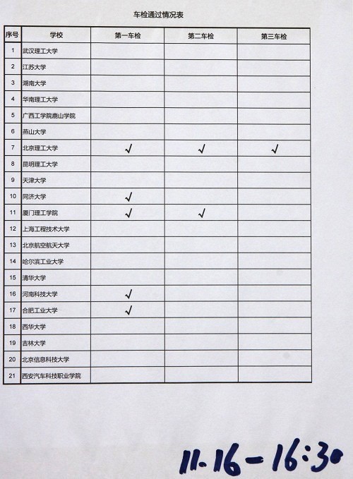 车检一共分为三项。第一项内容包括检查车架管件、赛手五秒逃生和检查电路,第二项包括侧倾检测与轴荷分配检测,第三项为噪声检测与制动检测。除了第一项检测中我校赛车按照裁判要求进行了微调,其余所有项目均一次通过,成为第一支通过车检的参赛队,受到组委会和媒体的好评。