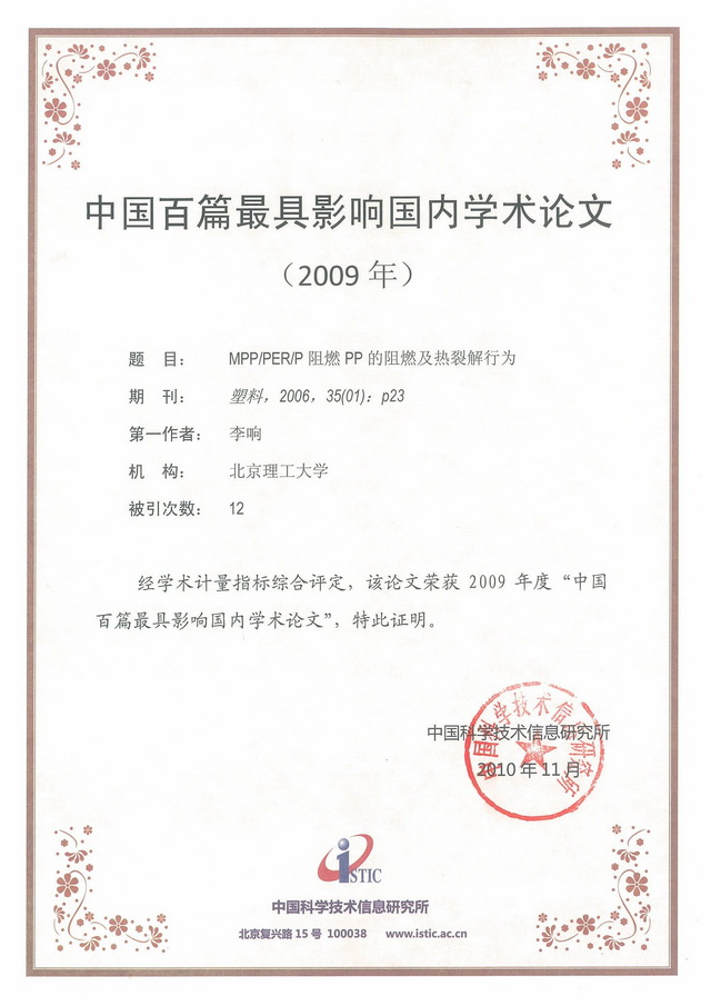 在2010年11月26日召开的“中国科技论文统计结果”发布会上,我校材料学院欧育湘教授指导、李响老师作为第一作者的论文《MPP/PER/P阻燃PP的阻燃及热裂解行为》(Flame Retardant and Thermal Pyrolytic Behaviour of PP Flame-Retarded with MPP/PER/P System)入选“2009年度中国百篇最具影响国内学术论文”。这是我校首次获此殊荣。