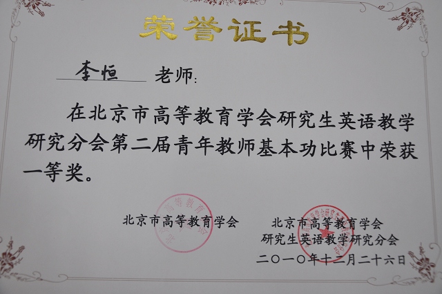 日前,我校外国语学院研究生英语教研室李恒老师荣获北京市高等教育学会研究生英语教学研究分会第二届青年教师教学基本功比赛一等奖。北京市高等教育学会研究生英语教学青年教师教学基本功比赛始于2009年12月,旨在加强青年教师队伍建设,鼓励青年教师提高教学基本功水平,重视教学技能创新,推进现代教育技术在教学中的应用,为教育教学改革,提高教师人才培养质量发挥推动作用,同时也为了给青年教师搭建一个展示教学风采、交流和切磋教学基本技能的平台。