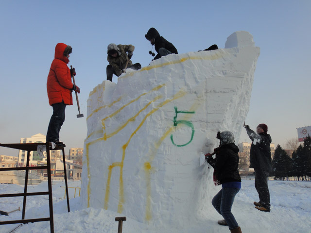 决赛中,整个作品须在27立方米的雪块上完成。由于是特制雪,雪块硬度非常大,这也给第一次参赛的同学们带了不小的困难。第一天下来,同学们体力消耗非常大,吃晚饭时手几乎拿不动筷子。通过与往届获奖队伍的交流,结合实际操作的经验,同学们逐渐掌握了雪雕的方法。在刺骨的寒风中,同学们互相鼓励、团结协作,他们常常说的就是,“我们一定能完成!”。我们的旁边的泰国队是上一届雪雕大赛的冠军。他们被同学们拼搏努力地精神深深地感染,连连称赞我们“good”。交流过程中,他们还经常竖起大拇指称赞女队员汪芳为“wonderful woman”。比赛过程中,校团委副书记张春程老师到现场看望了参赛队员,为同学们打气助威。他勉励同学注意身体,放下包袱,只跟自己比赛,将雪雕作品尽力做到最好。