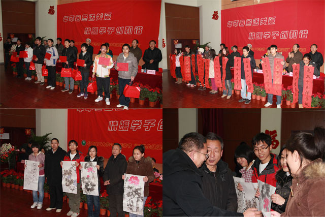 会上,学校领导为学生代表发放了寒假往返路费、慰问品,并向他们赠送了由退休老干部和无阳斋书画社同学书写的春联及印有良乡校区风光的精美台历。随后,我校书画摄影协会副会长黄发荣老师和孙和平老师,亲笔书写对联,绘制年画,并赠送给了同学们。