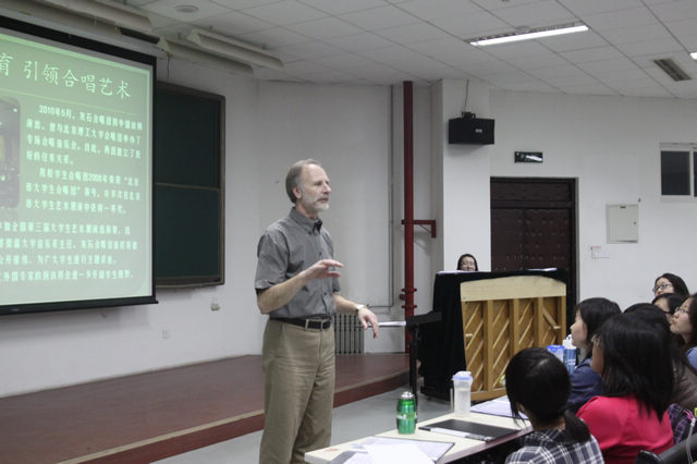 我校学生合唱团是北京教委评定的“北京大学生合唱团”。该学生合唱团十余年来为学校的艺术环境建设以及校园文化艺术活动做出了突出贡献,在校内外为学校赢得了良好的声誉。今年10月由教育部组织举办的“第三届全国大学生艺术展演”北京地区选拔赛即将拉开序幕,我校学生合唱团在苦练内功的同时,特邀请加拿大萨斯喀彻温大学音乐系主任、哥德尔•朗格纳博士(Dr. Gerald Langner)来我校为学生合唱团讲学。