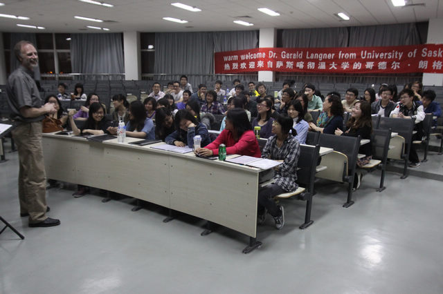 4月20日晚7:00 Langner博士在良乡校区为学生合唱团进行了公开排练课,有近100名学生观摩了这次排练活动。这是Langner博士来校学生合唱团讲学的系列活动之一。在今后的几天里Langner博士还要就萨斯卡彻温大学的音乐教育普及、音乐课选修、学科建设以及合唱音乐发展等进行交流、讲座以及专题排练等活动。
