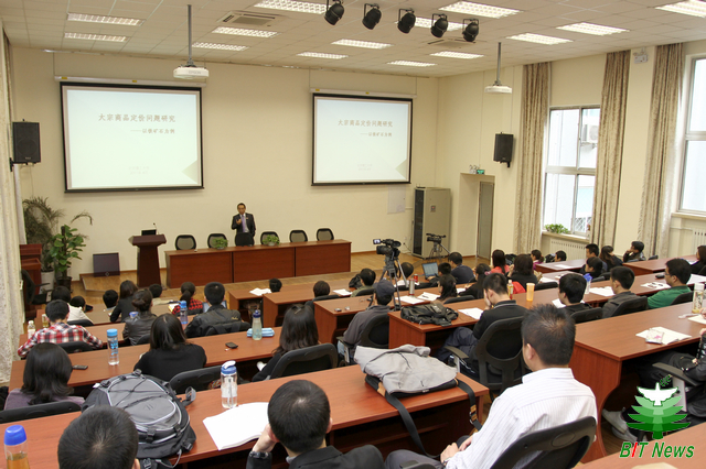 聘任任仪式后,下午四点,郭生祥教授在主楼管理与经济学院的241教室举行了学术讲座, 讲座的内容是以铁矿石为例的大宗商品定价问题。整个讲座理论联系实际,由世界铁矿石贸易状况和市场分布等,到定价模式和金融衍生品,由中澳铁矿石之争到未来全球大宗商品价格走势的预测等。