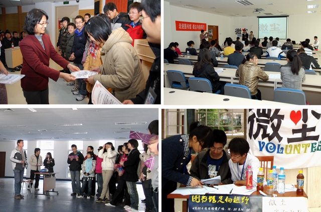 “微尘志愿者队”是为了向图书馆提供志愿服务而成立的学生社团,自2010年9月成立以来,在基础教育学院理材学部和徐特立图书馆的共同培育下,志愿者队伍不断发展、壮大,由最初的21人发展到现在的160多人。他们秉承“服务他人,快乐自己”的信念,利用课余时间参与图书、报刊整理等看似简单而又平凡的工作。但简单的事认真做就不简单,平凡的事坚持做就不平凡。他们凭借自己的双手、头脑、知识和爱心持之以恒地真心奉献,不断创新工作方法,拓宽工作内容,以高度的责任心来实现“高效率、高品质”的志愿服务。开馆的每一天,在阅览室内、书刊架旁都可以看到他们忙碌的身影,至今已累计志愿服务2500余小时,为图书馆优化读者服务工作做出了突出贡献。